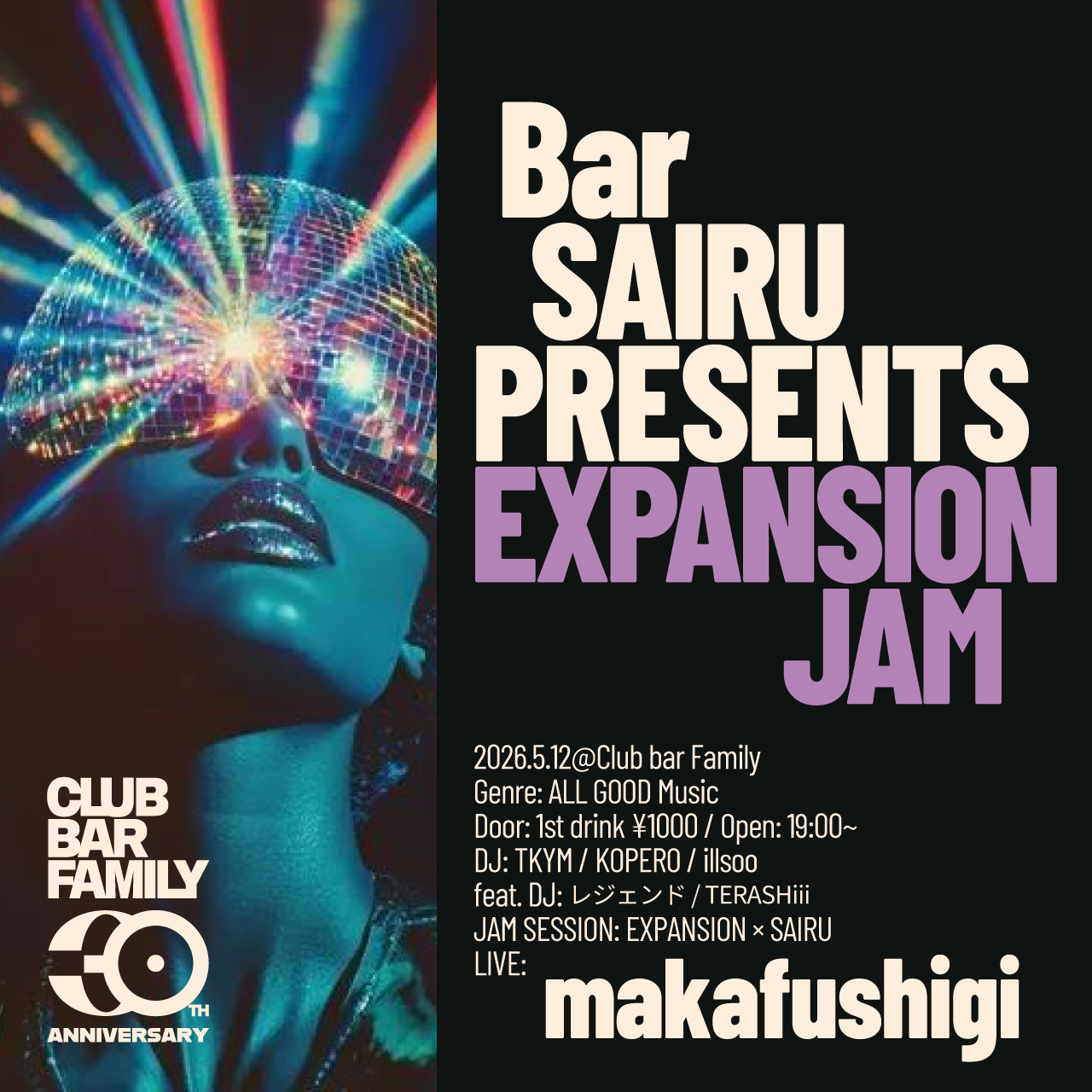 奇数月は、小林 "Bobsan" 直一と数井 塁のファンク・コミュニティ"EXPANSION"がホスト務めるFUNKなセッションありバージョンの月になります!今回もEXPANSION × SAIRUでのLive Sessionを中心にお送りします!